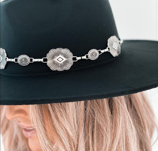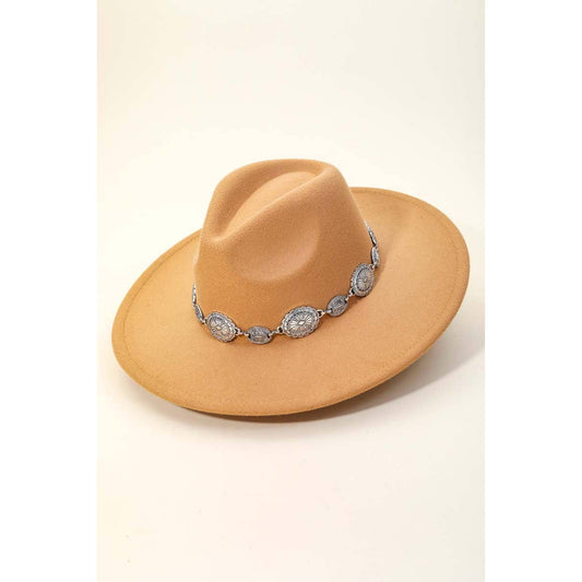 Concho Chain Strap Flat Brim Fedora Fashion Hat