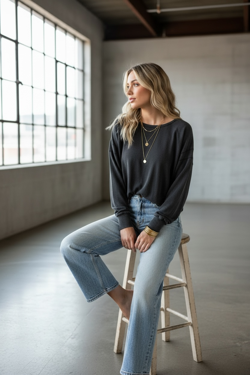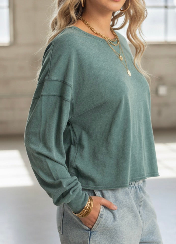 Crafted from soft cotton with an acid wash finish, this top boasts a round neckline and drop shoulders with extra long sleeves, ribbed cuffs, exposed seams and raw edge hems, and a cross detail open back. The cut is a cropped, oversized fit and pairs well with high-waisted joggers for a chic laid-back look.