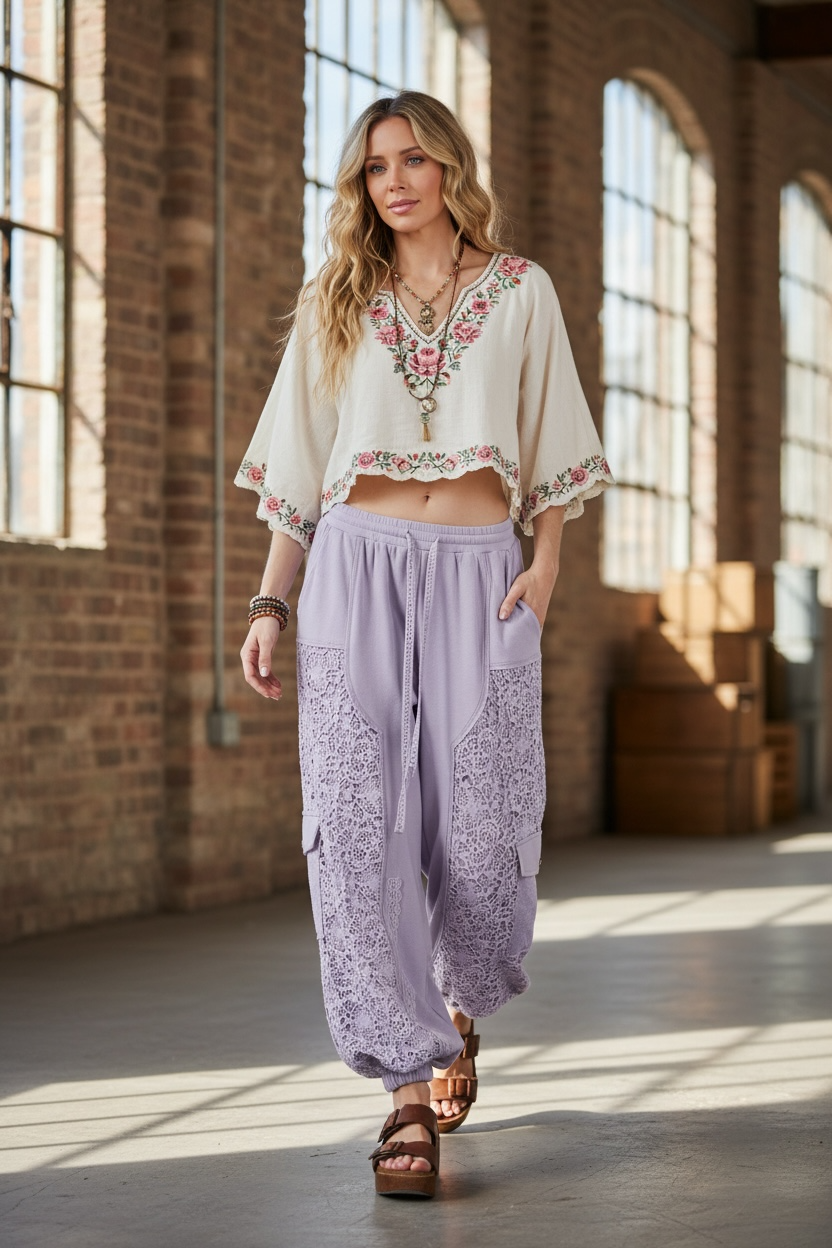 Lavender lace cargo pants with adjustable waist and jogger style, featuring a relaxed fit and a flowy design #boho