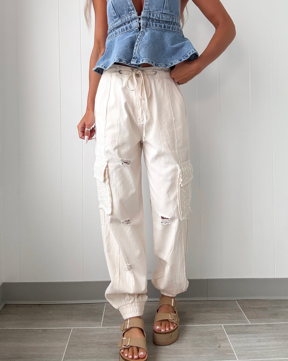 Comfortable jogger denim pants with trim loop in waistband, side crochet lace pocket, and distress detailing.