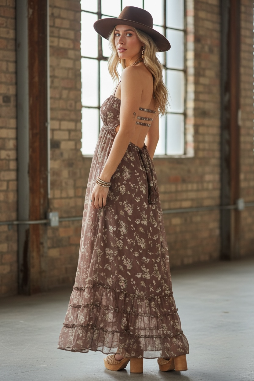 This elegant maxi dress features a smocked bodice and delicate spaghetti straps. With a flowing floral print skirt adorned with subtle tiered ruffle details, it offers a charming silhouette. Pair with strappy sandals and a wide-brim hat for a chic, breezy look.