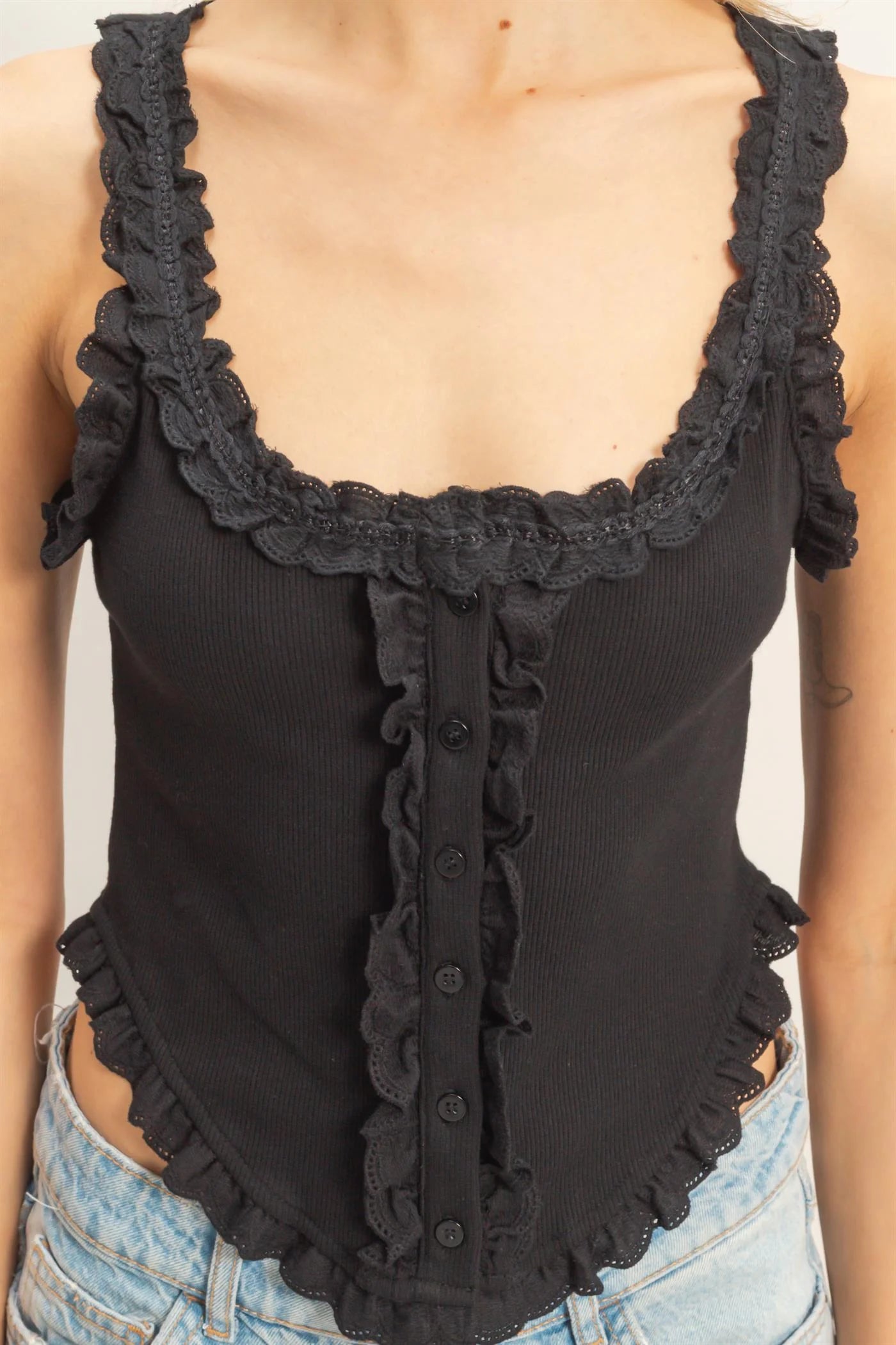 Discover a charming tank top featuring a delicate lace ruffle trim along the square neckline and straps. This fitted piece is enhanced with a button closure front for an added touch of elegance. Style with high-waisted denim shorts and sandals for a playful summer ensemble.