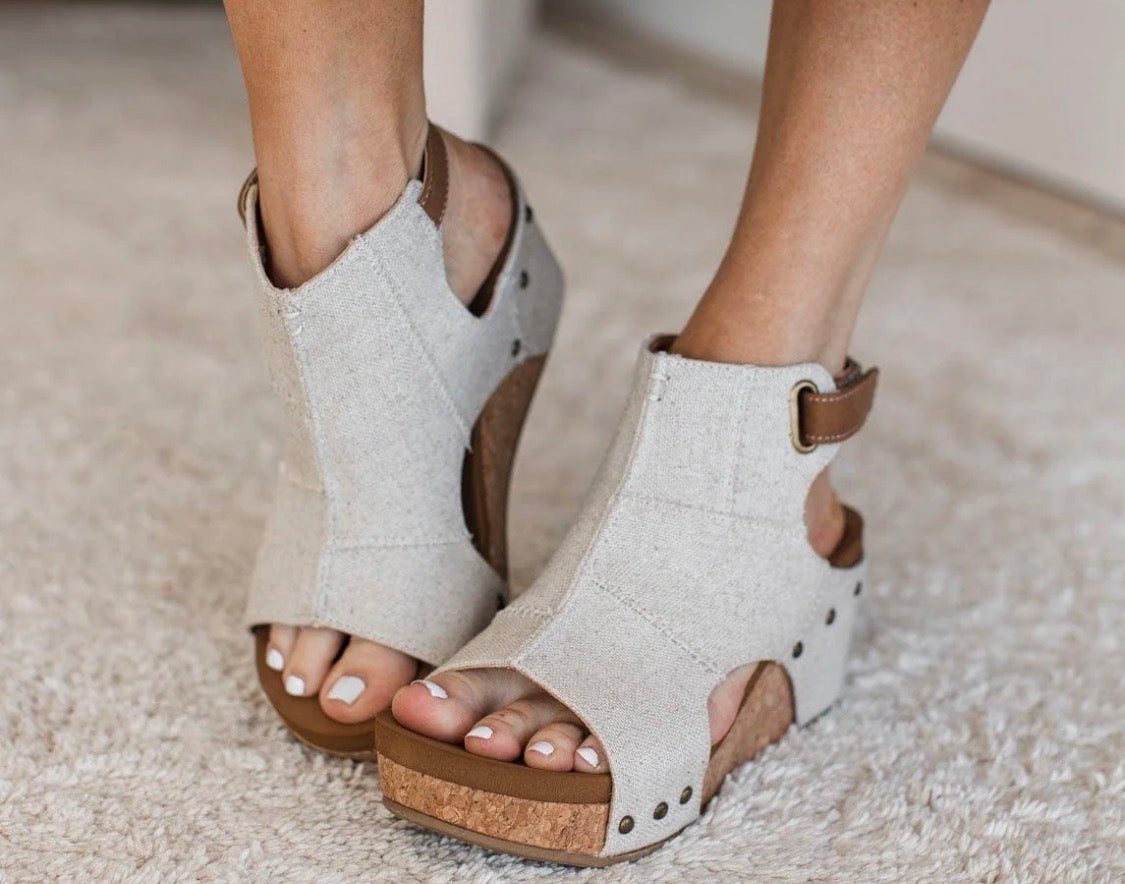Breeze into the season with the laid-back elegance of the VERY G Lala Wedge Sandal in Natural. Featuring a neutral, patchwork-inspired canvas upper and a cork wedge sole with just the right touch of studded detailing, this sandal is the perfect blend of casual and statement-making. The Velcro strap makes slipping them on a breeze, while the cushioned footbed—layered with 1/2" of foam padding—keeps you comfy from sunrise to sunset. Whether you're dressing up denim or floating around in your favorite sundress, the Lala Wedge brings that easy, earthy flair to any look.