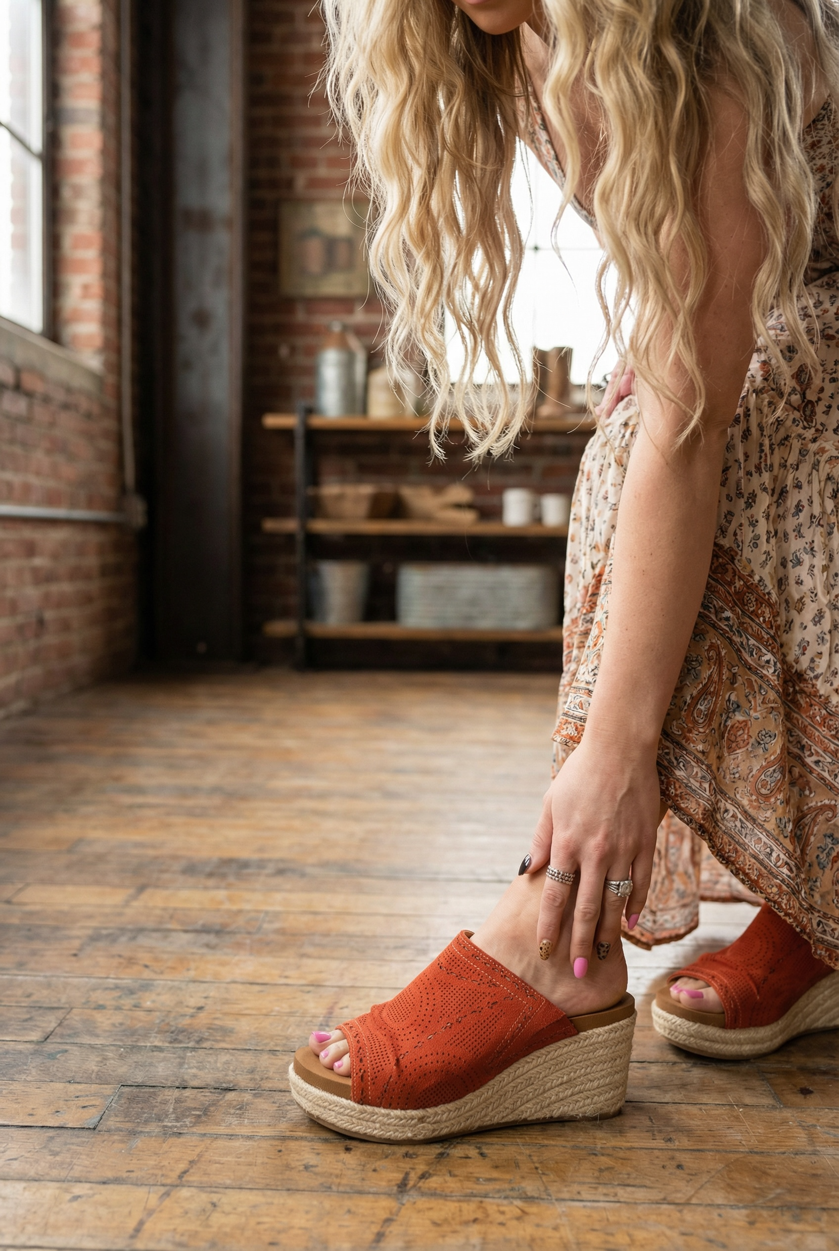 Step into style with the Marie Espadrille for Women in Rust. These slides feature laser cut upper, espadrille wedge and a slip-on style making sure you are both fashionable and comfortable. Perfect for any occasion!